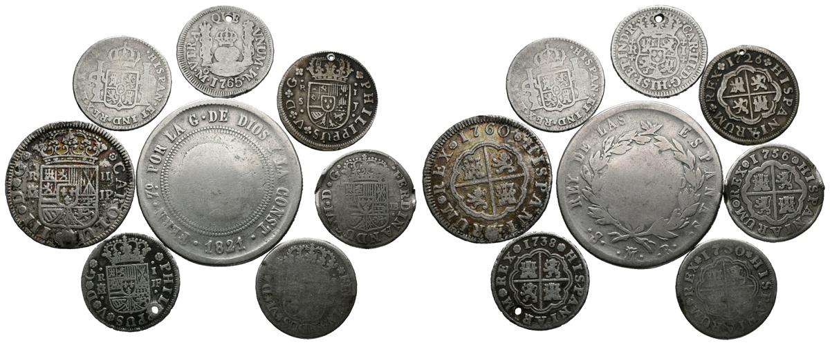 MONARQUIA ESPAÑOLA. Interesante conjunto formado por 8 monedas de plata de periodos comprendidos entre los reinados de Felipe V y Fernando VII. Diferentes estados de conservación. A EXAMINAR.