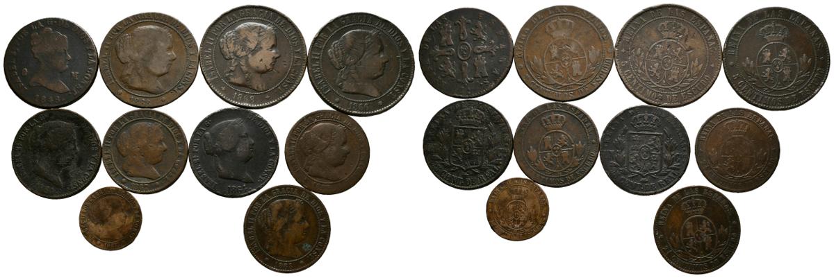 MONARQUIA ESPAÑOLA. Bonito lote compuesto por 10 cobres acuñados durante el reinado de Isabel II. Diferentes módulos así como estados de conservación. A EXAMINAR.