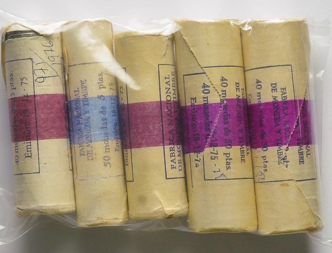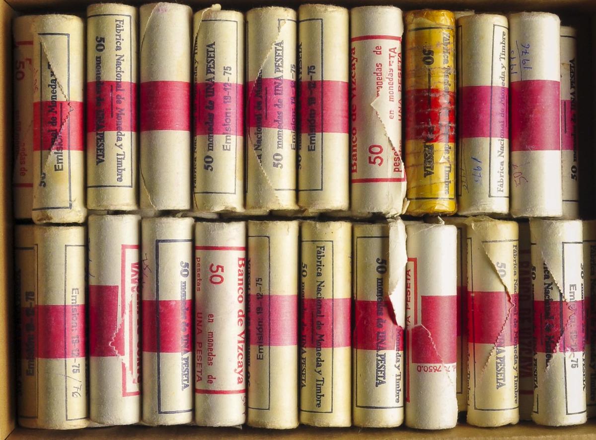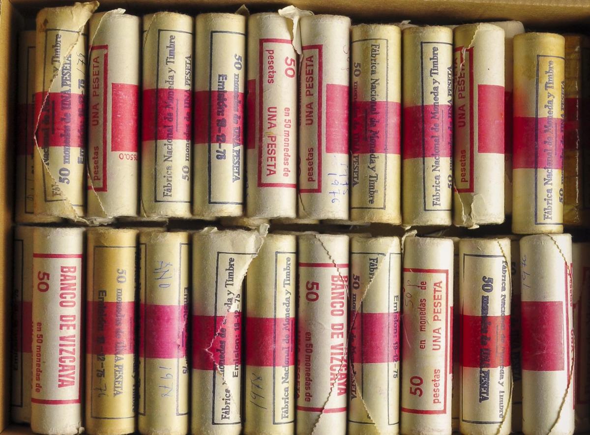 CONTEMPORANEO. Lote compuesto por decenas de cartuchos de 1 Peseta de 1975 emitidos por el Banco de Vizcaya, el lote también contiene 5 cartuchos de diferentes valores emitidos por el Banco de España. A EXAMINAR.
