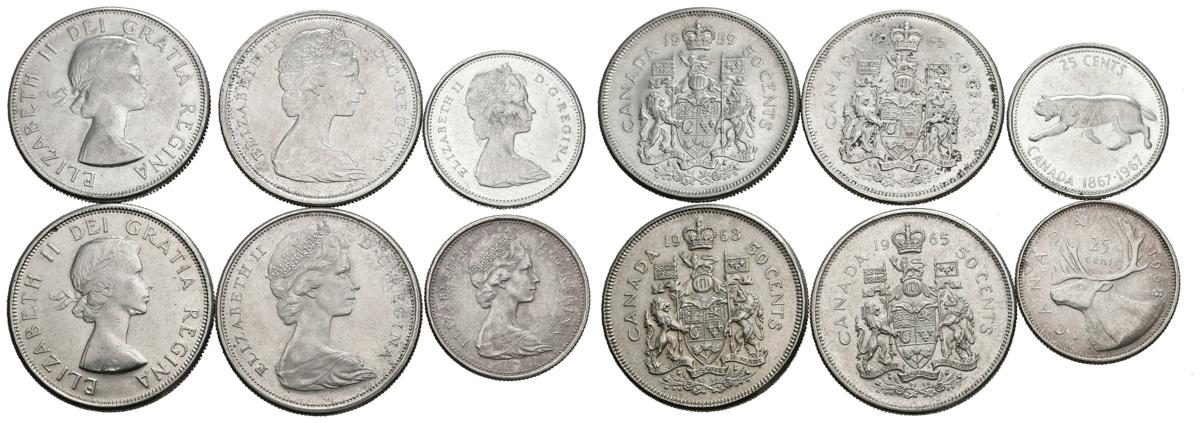 CANADA. Interesante conjunto compuesto por 6 monedas de plata de 25 y 50 cents de diferentes fehas así como estados de conservación. A EXAMINAR