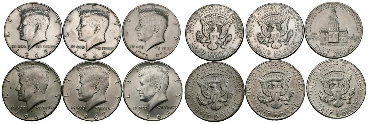 MONEDAS EXTRANJERAS. Interesante lote compuesto por 6 monedas de Estados Unidos de 1/2 Dollar de plata de fechas comprendidas entre 1964 y 1976. Incluye una pieza de plata. Ninguna moneda repetida. Diferentes estados de conservación, incluyendo el SC. A EXAMINAR.