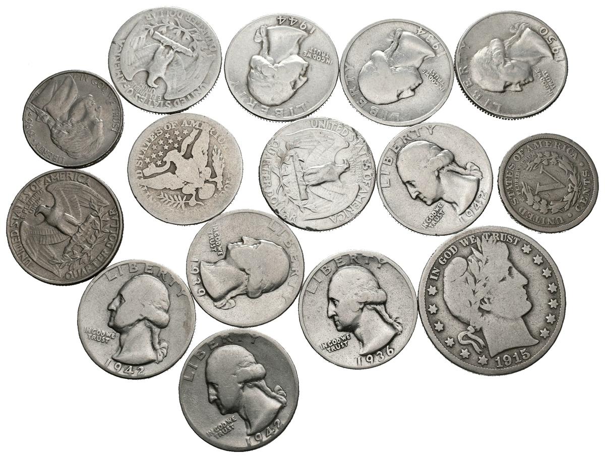 MONEDAS EXTRANJERAS. Bonito conjunto de 15 platas estado unidenses con una gran variedad de fechas desde principios del siglo XX. Varios módulos con mayoría de quarter dollars. Diferentes estados de conservación. A EXAMINAR