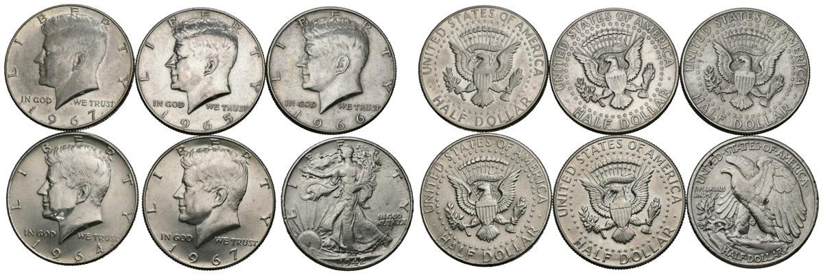 MONEDAS EXTRANJERAS. Interesante lote compuesto por 6 monedas de Estados Unidos de 1/2 Dollar de plata de fechas comprendidas entre 1942 y 1967. Incluye dos piezas de plata. Diferentes estados de conservación, incluyendo el SC. A EXAMINAR.