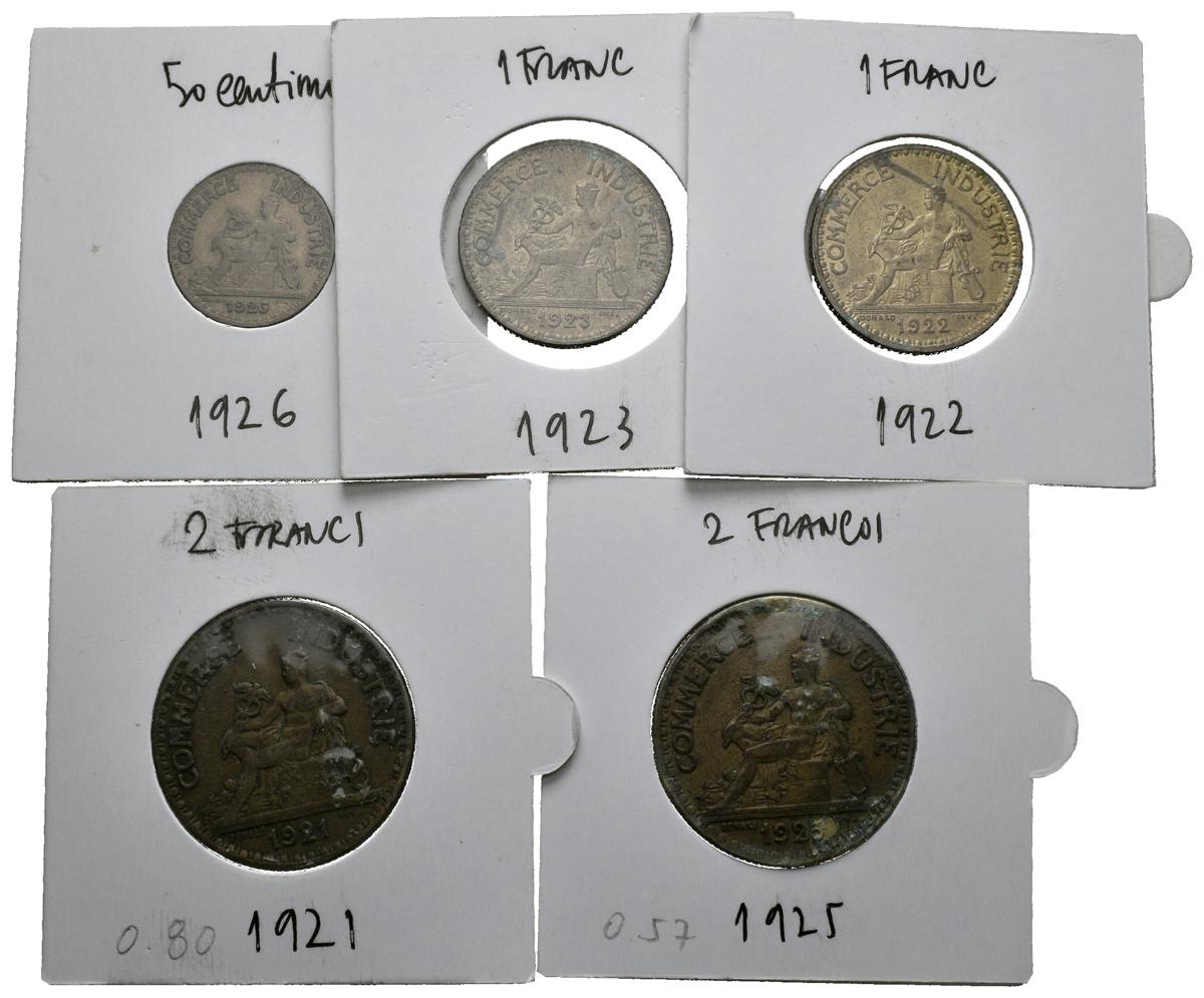 MONEDAS EXTRANJERAS. Interesante conjunto de 5 piezas de Chambres de Commerce con valores de 50 Centimes, 1 y 2 Francs de fechas comprendidas entre 1921 y 1926. Ninguna moneda repetida. Diferente estado de conservación. A EXAMINAR.
