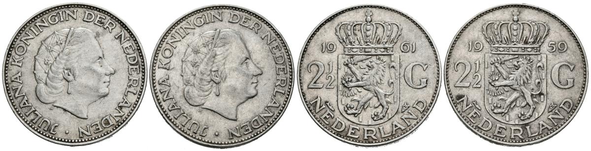 PAISES BAJOS. Conjunto de 2 monedas de 2 1/2 Gulden plata de los años 1959 y 1961. Diferentes estados de conservación. A EXAMINAR.