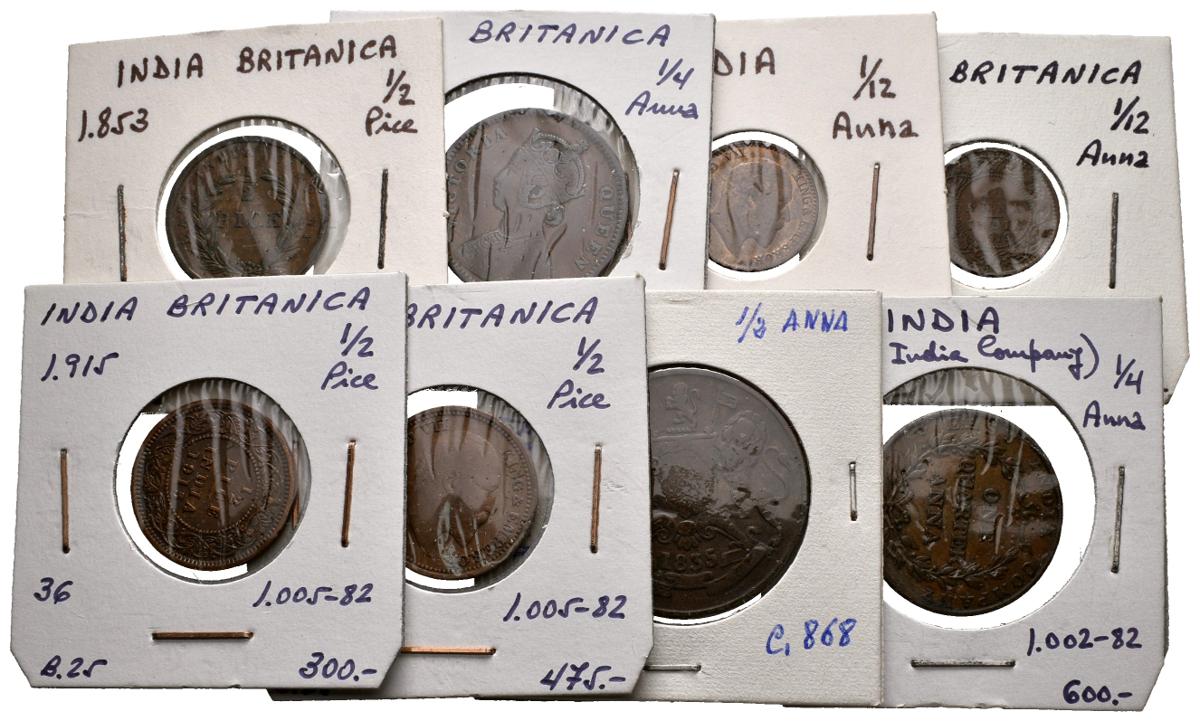 INDIA BRITÁNICA. Lote de 8 monedas de la India Británica. Valores de 1/2, 1/4 y 1/12 de Anna. Fechas desde 1835 hasta 1919. Diferentes estados de conservación. A EXAMINAR.