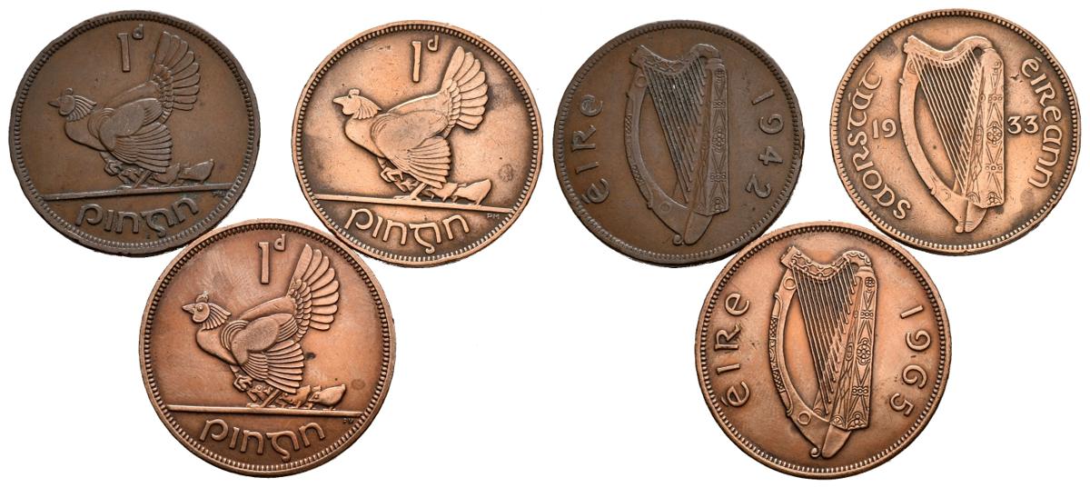REPÚBLICA DE IRLANDA. Bonito conjunto de 3 piezas 1 Penny de los años 1933, 1942 y 1965. Leyendas en gaélico. Alto grado de conservación general. A EXAMINAR.