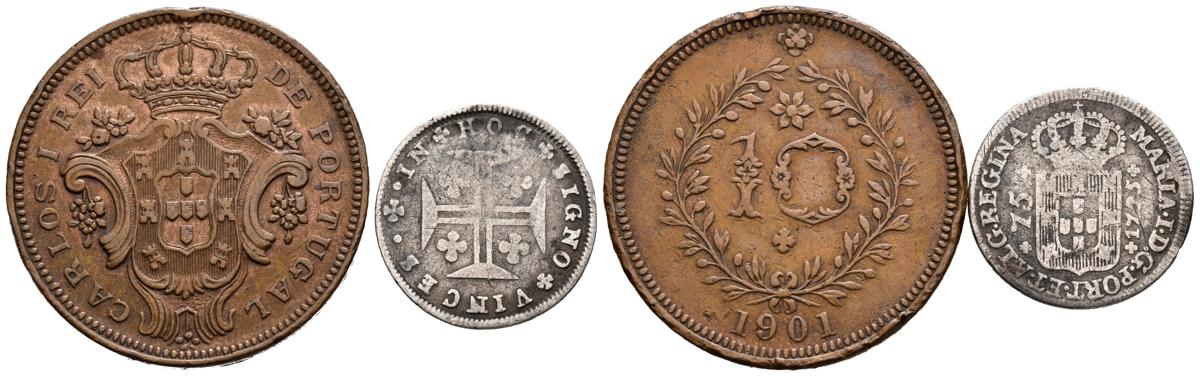 PORTUGAL (Azores). Bonito conjunto de 2 monedas acuñadas de los siglos XVIII y XX (Reinados de D. María I y D. Carlos I). Diferentes módulos, materiales así como estados de conservación. A EXAMINAR.