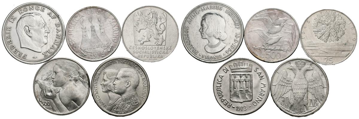 MONEDAS EXTRANJERAS. Conjunto de 5 monedas europeas de plata, de diferentes países (Dinamarca, San Marino, Checoslovaquia y Grecia) fechas y módulos. Alto grado de conservación en general. A EXAMINAR.