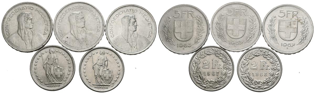 MONEDAS EXTRANJERAS. Conjunto de 5 monedas de Suiza de 2 y 5 Francos de plata de 1965 y 1967. Diferentes estados de conservación, incluyendo piezas sin circular. A EXAMINAR.