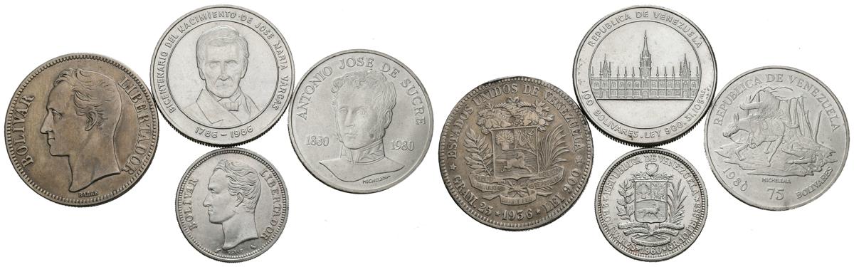 MONEDAS EXTRANJERAS. Conjunto de 4 piezas de plata de Venezuela con variedad de valores y de fechas comprendidas entre 1936 y 1986. Alto estado de conservación en general. A EXAMINAR
