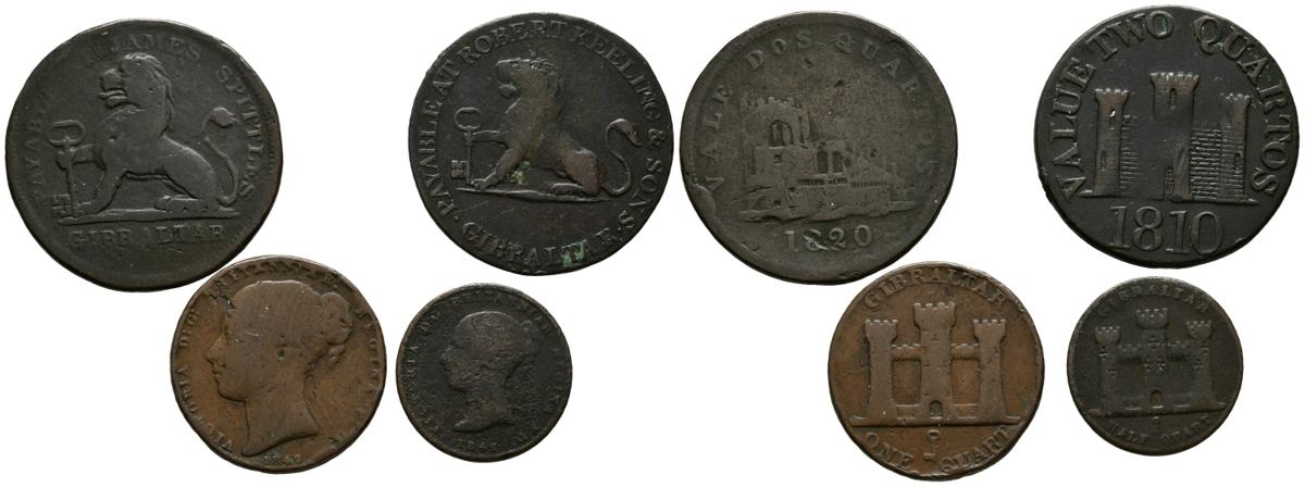 MONEDA EXTRANJERA. Conjunto formado por 4 cobres acuñados en Gibraltar entre los años 1810 y 1842. Valores de 1/2, 1 y 2 Quartos. Diferentes estados de conservación. A EXAMINAR