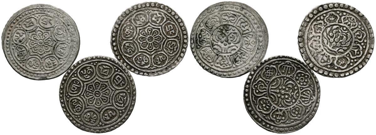 MONEDA EXTRANJERA. Precioso conjunto de 3 monedas de 1 Tangka del Tibet acuñadas en tiempo de los décimo tercer y décimo cuarto Dalai Lamas Thubten Gyatso y Tenzin Gyatso. Diferentes estados de conservación. A EXAMINAR.