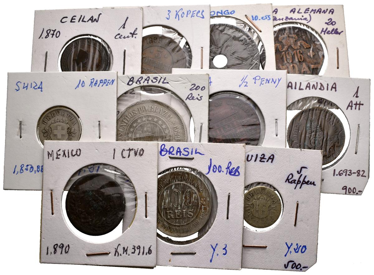 MUNDIAL. Lote compuesto por 11 monedas del siglo XIX y principios del siglo XX. Diferentes materiales y valores. Destacan 10 Centimes del Congo Belga de 1888 y 20 Heller de Tanzania de 1916. Diferentes estados de conservación. A EXAMINAR.