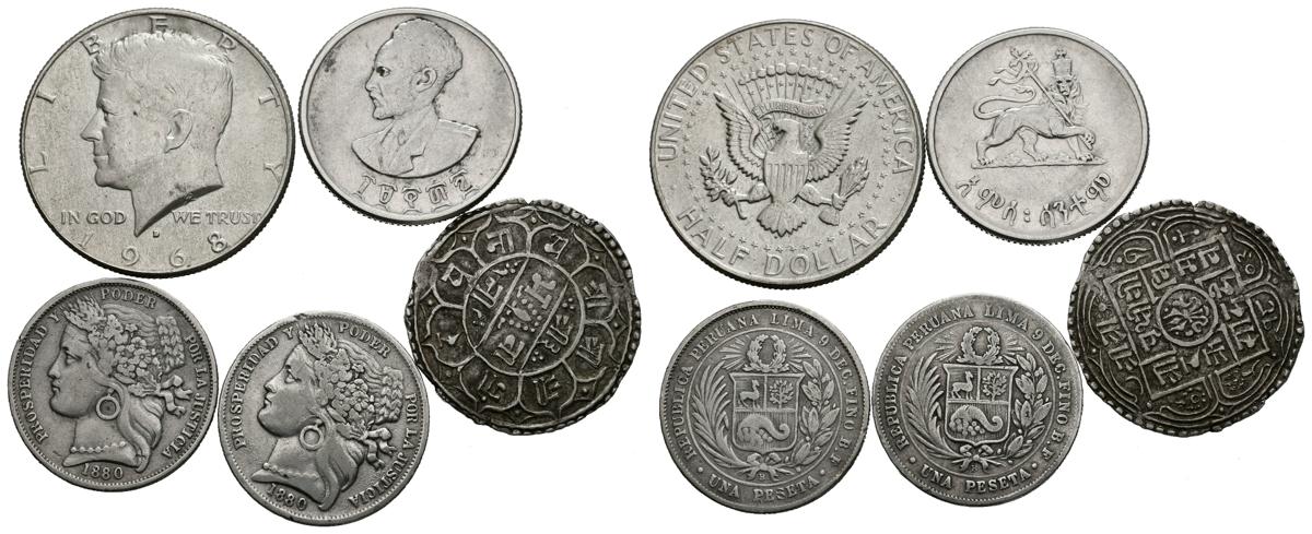 MONEDA EXTRANJERA. Interesante conjunto de 5 monedas mundiales, 4 de ellas de plata, de diferentes países, módulos así como estados de conservación. A EXAMINAR.