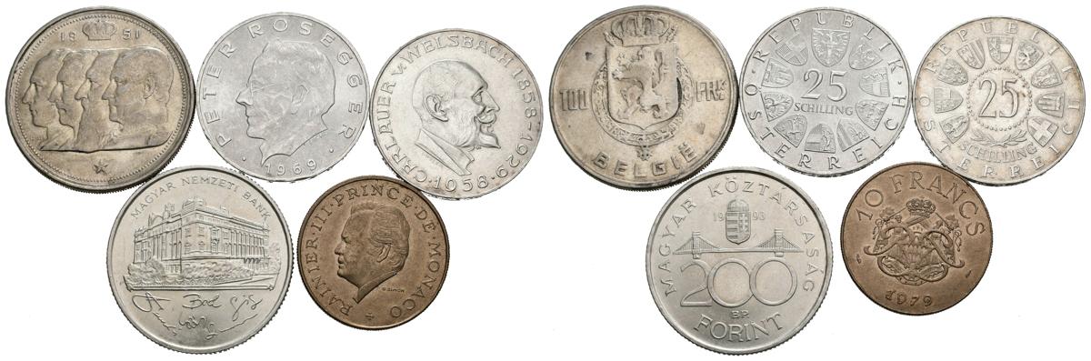 MONEDAS EXTRANJERAS. Conjunto de 5 monedas europeas de diversos materiales, mayoría de plata, de diferentes países (Mónaco, Bélgica, Hungría y Austria) fechas y módulos. Alto grado de conservación en general. A EXAMINAR.
