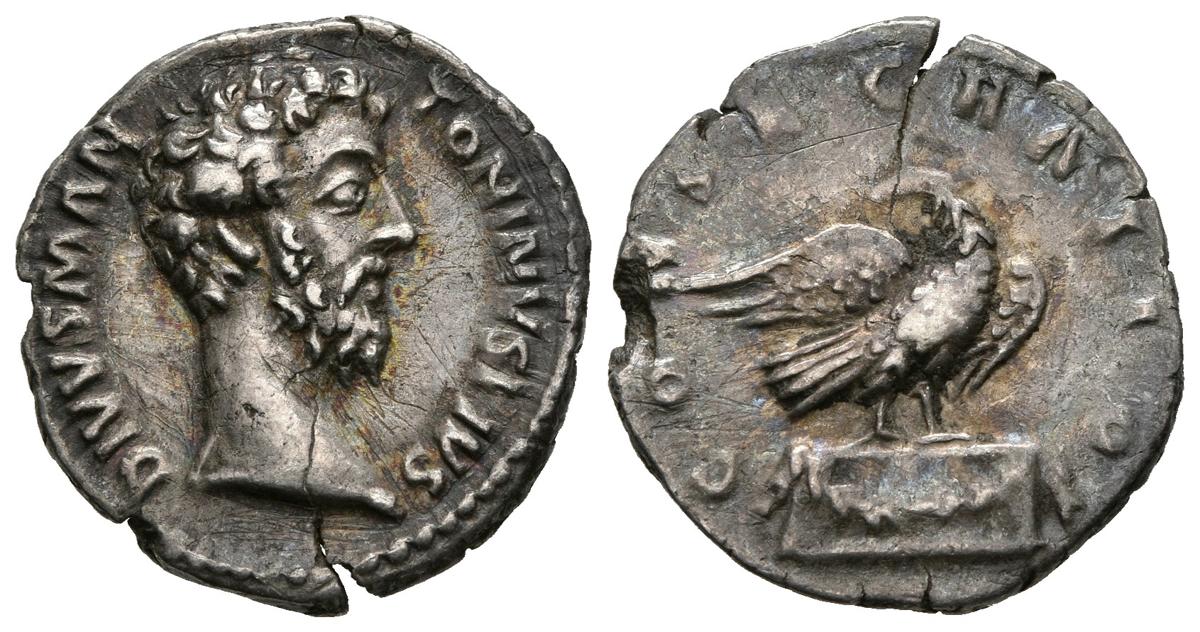 DIVO MARCO AURELIO. Denario. (Ar. 2,54g/18mm). 180 d.C. Roma. Anv: DIVVS M ANTONINVS PIVS. Busto desnudo a derecha de Marco Aurelio. Rev: CONSECRATIO. Aguila estante mirando a izquierda sobre altar decorado. (RIC 272). MBC+.