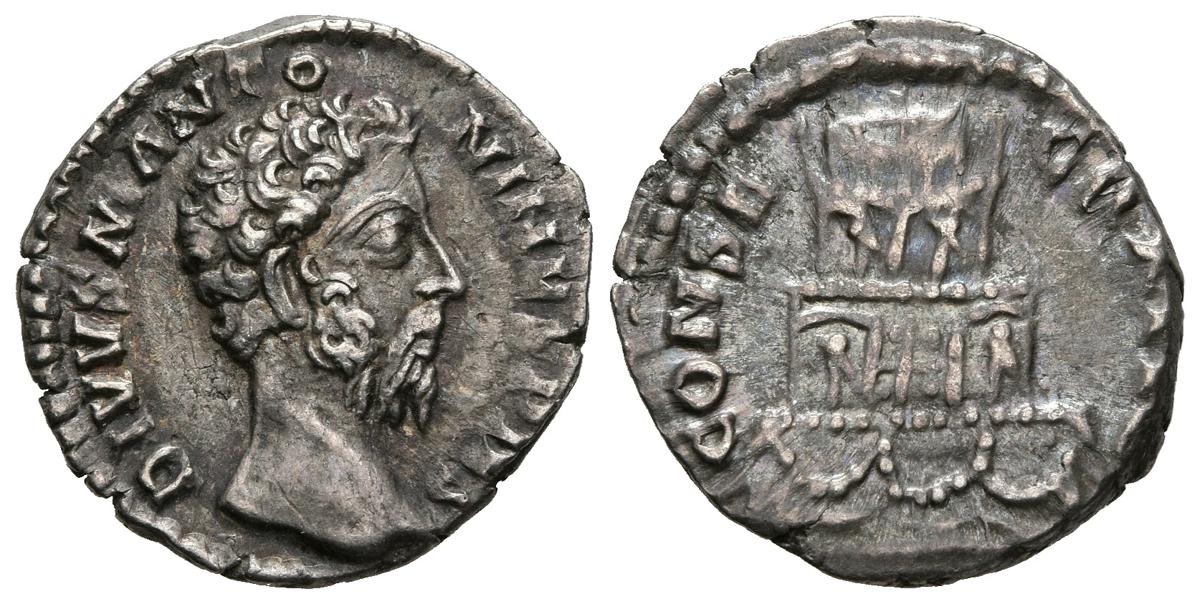 DIVO MARCO AURELIO. Denario. (Ar. 2,29g/18mm). 180 d.C. Roma. Anv: DIVVS ANTONINVS PIVS. Busto desnudo a derecha de Marco Aurelio. Rev: CONSECRATIO. Pira funeraria de cuatro niveles adornada con guirnaldas y estatuas, encima Marco Aurelio en cuádriga de frente. (RIC 275). MBC+.