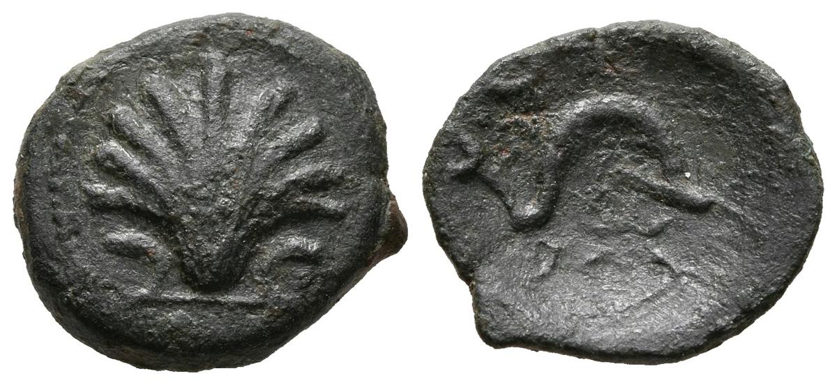 ARSE-SAGUNTUM (Sagunto, Valencia). Sextante (Ae. 1,50g/14mm). 170-20 a.C. Anv: concha. Rev: delfín a derecha, encima creciente y letra ibérica y debajo estrella. (FAB-2064). MBC.