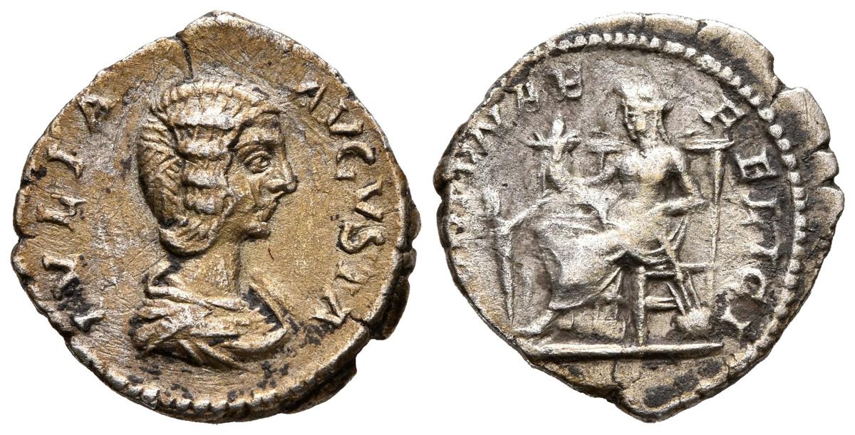 JULIA DOMNA. Denario. (Ar. 2,82g/19mm). 207-211 d.C. Roma. (RIC 554). Anv: Busto de Julia Domna drapeado a derecha, alrededor leyenda: IVLIA AVGVSTA. Rev: Fortuna sentada a izquierda, sosteniendo cornucopia en la mano derecha y timón en la izquierda, delante niño, alrededor leyenda: FORTVNAE FELICI. MBC-.