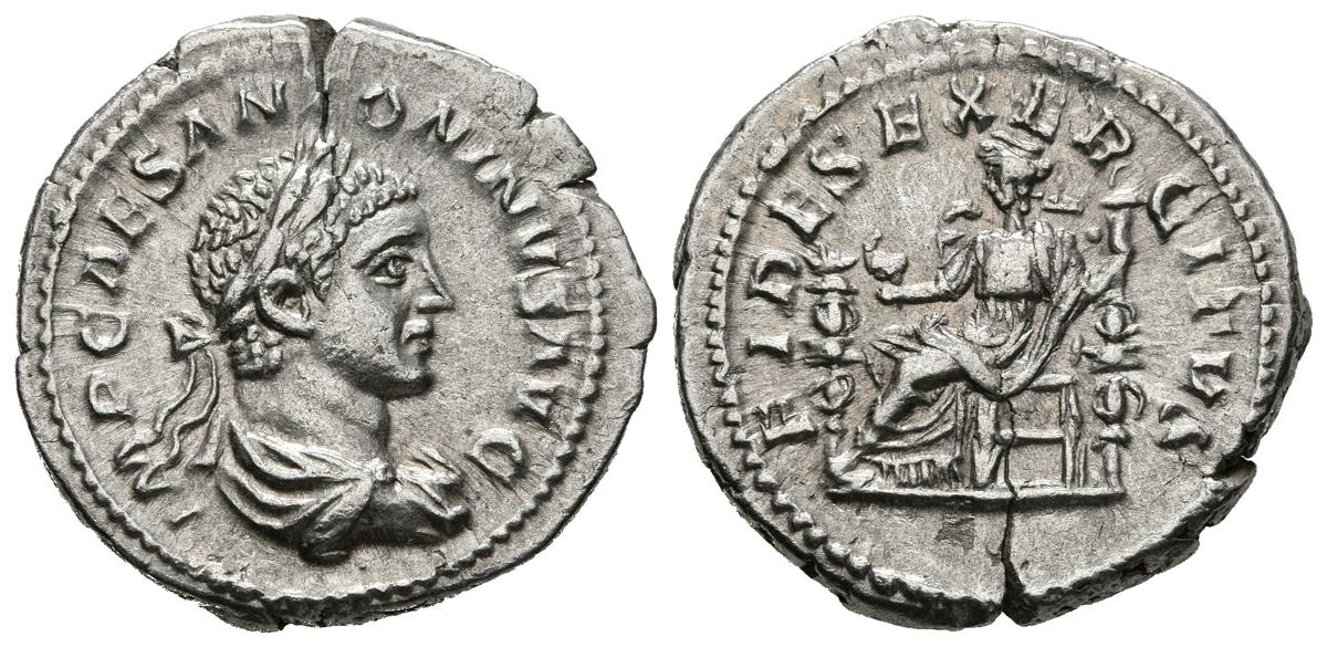 HELIOGABALO. Denario. (Ar. 3,53g/20mm). 219 d.C. Roma. (RIC 68). Anv: IMP CAESAR ANTONINVS AVG. Busto laureado y drapeado de Heliogábalo a derecha. Rev: FIDES EXERCITVS. Fides sentada a izquierda sosteniendo águila y estandarte, delante otro estandarte. MBC+.