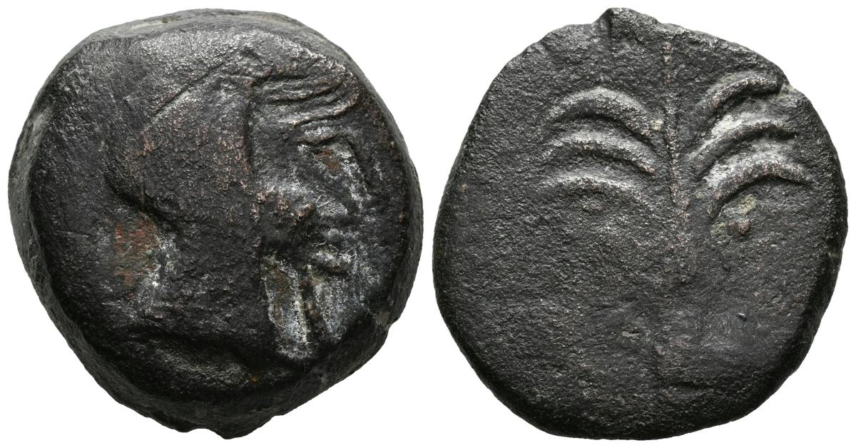 BARIA (Villaricos, Almería). As. (Ae. 20,48g/25mm). 200-100 a.C. (FAB-213). Anv: Cabeza de Heracles con piel de león a derecha. Rev: Palmera con frutos. BC.