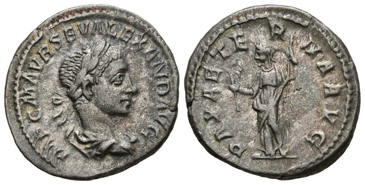 ALEJANDRO SEVERO. Denario. (Ar. 3,25g/20mm). 222-228 d.C. Roma. Anv: IMP C M AVR SEV ALEXAND AVG. Busto laureado y drapeado a derecha de Alejandro Severo. Rev: PAX AETERNA AVG. Pac estante a izquierda portando cetro y rama. (RIC 165). MBC+.