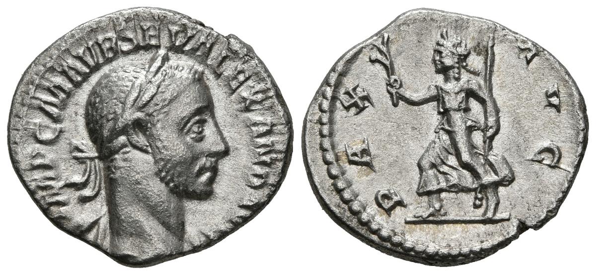 ALEJANDRO SEVERO. Denario. (Ae. 2,89g/19mm). 226 d.C. Roma. (RIC 168). Anv: IMP C M AVR ALEXAND AVG. Busto laureado de Alejandro Severo a derecha. Rev: PAX AVG. Paz avanzando a izquierda con rama de olivo y cetro. EBC-.