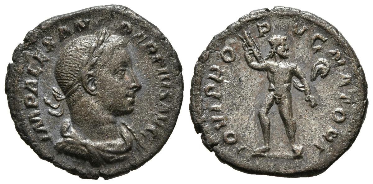 ALEJANDRO SEVERO. Denario. (Ar. 2,95g/19mm). 231 d.C. Roma. Anv: IMP ALEXANDER PIVS AVG. Busto laureado, drapeado y con coraza a derecha de Alejandro Severo. Rev: IOVI PROPVGNATORI. Júpiter estante a derecha portando rayo. (RIC 235). MBC.