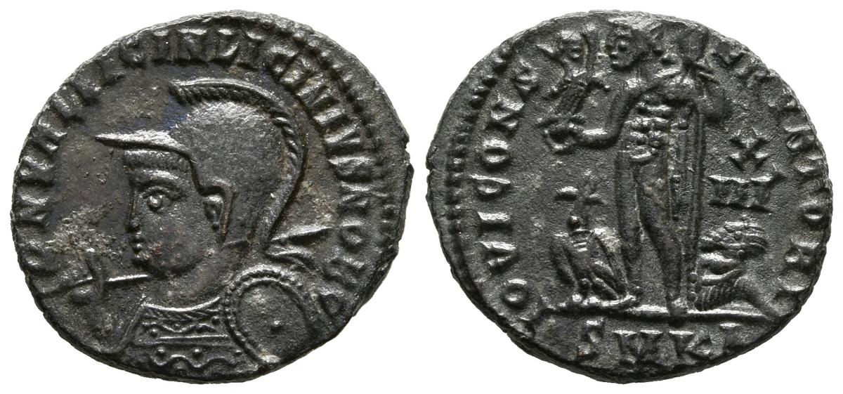 LICINIO II. Nummus. (Ae. 3,14g/19mm). 318-320 d.C. Cícico. (RIC 18). Anv: Busto con casco y coraza de Licinio II a izquierda, sosteniendo lanza en hombro derecho y escudo en el izquierdo, alrededor leyenda: DN VAL LICIN LICINIVS NOB C. Rev: Júpiter de pie a izquierda sosteniendo cetro con aguila y Victoria en mano derecha, debajo aguila con corona a la izquierda y cautivo a derecha en el suelo, detrás XIII, en exergo: SMKr, alrededor leyenada: IOVI CONSERVATORI. EBC-.