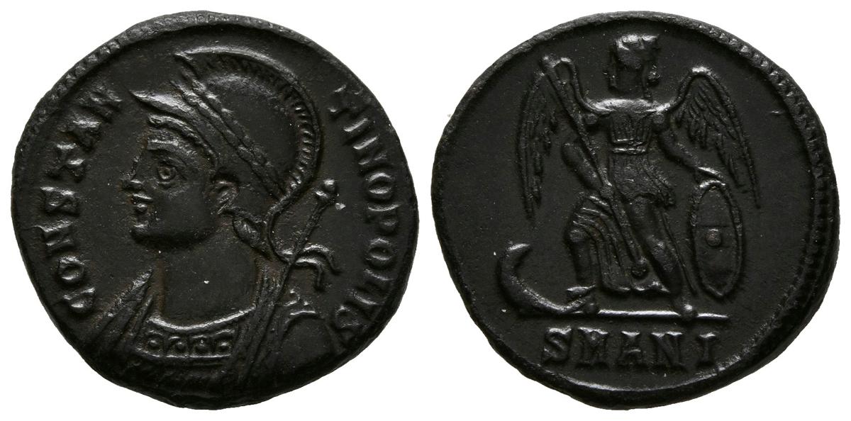 CONSTANTINO I, Serie conmemorativa. Follis. (Ae. 2,78g/18mm). 330-335 d.C. Antioquía. (RIC 92). Anv: CONSTANTINOPOLIS. Busto de Constantinopla drapeado con coraza y casco a izquierda, portando cetro. Rev: Victoria estante a izquierda sobre proa portando lanza y escudo, en exergo SMANI. EBC+. Bonita pátina oscura. Precioso ejemplar.