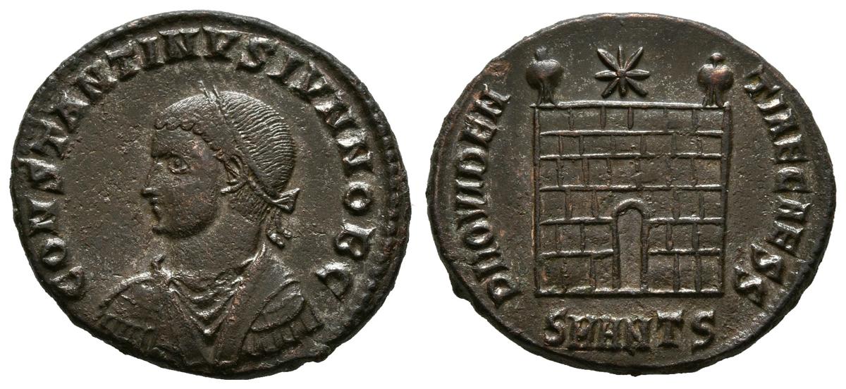CONSTANTINO II. Centenional. (Ae. 3,35g/20mm). 325-326 d.C. Antioquía. (RIC 66). Anv: CONSTANTINVS IVN NOB. Busto de Constantino II laureado, drapeado y con coraza a izquierda. Rev: PROVIDENTIAE CAES. Puerta del campamento con dos torres con estrella arriba; en exergo SMANTZ. MBC+/EBC-.