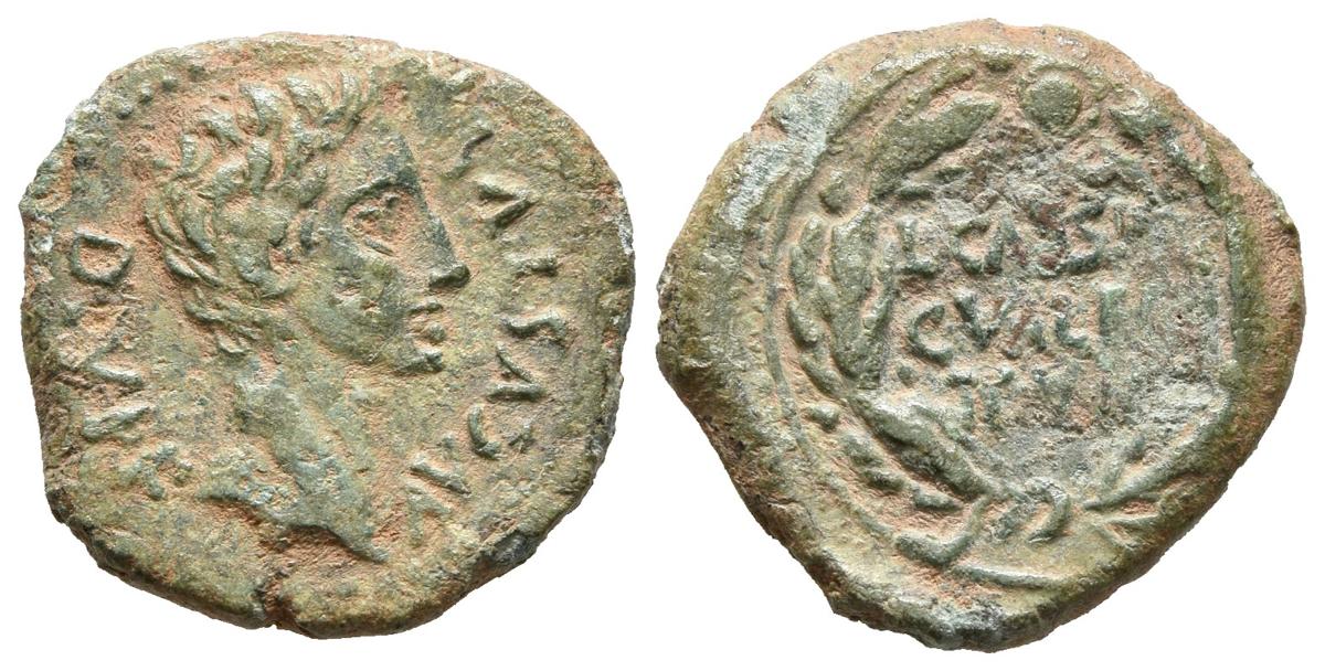 CAESARAUGUSTA (Zaragoza). Cuadrante. (Ae. 2,56g/17mm). 120-30 a.C. (FAB-339). Anv: Cabeza desnuda de Augusto a derecha, alrededor leyenda: DIVI F AVGVSTVS. Rev: Láurea, dentro leyenda: L CASSIO VALERIO II VIR. MBC+. Pátina verde.