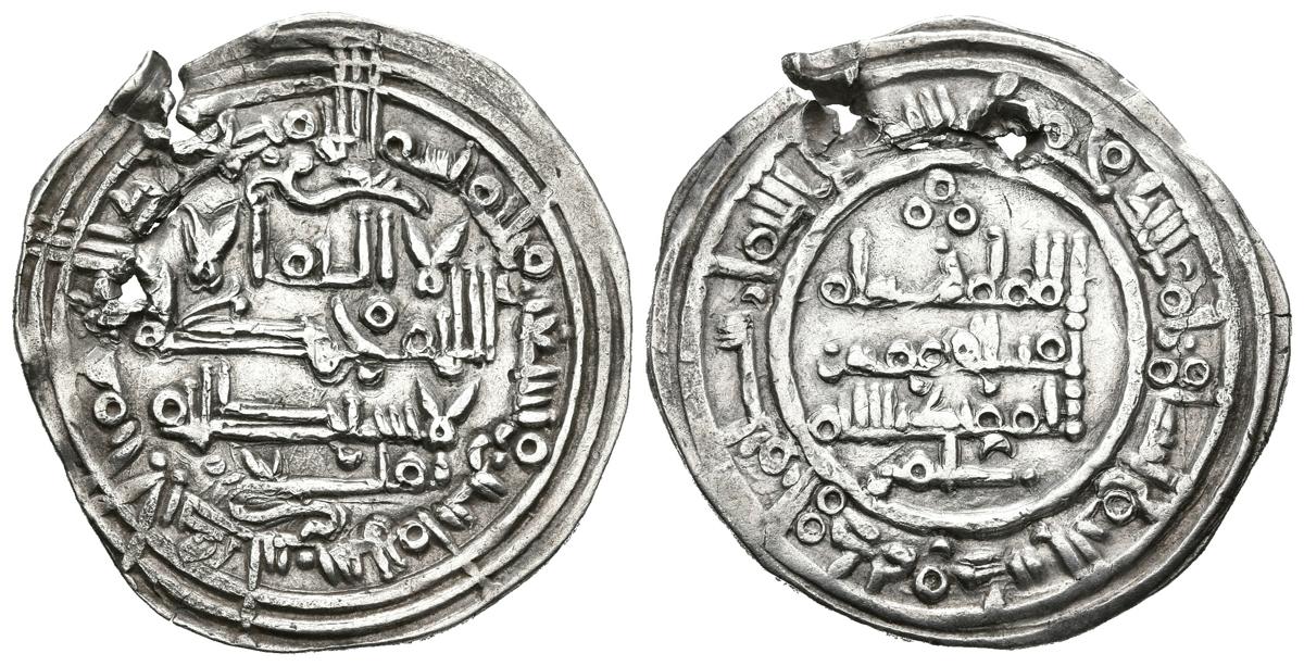 CALIFATO DE CORDOBA. Hisham II Al-Muayyad. Dirham. (Ar. 2,90g/25mm). 392H. (Vives 569; Frochoso no recoge esta combinación de adornos). Citando a Tamliy en I.A. y Amir en II.A. MBC+. Dos perforaciones.