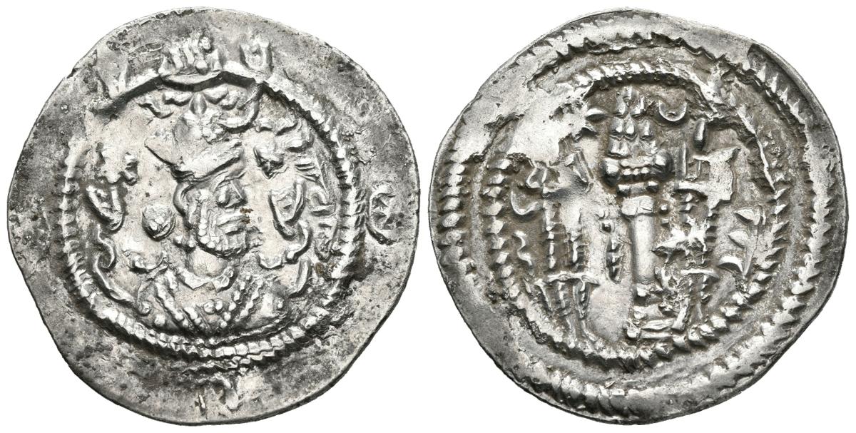 IMPERIO SASANIDA, Khusro I. Dracma. (Ar. 4,01g/30mm). Susa (AY). Anv: Busto de Khusro I coronado a derecha. Rev: Altar con fuego entre dos guardianes, todo dentro de tres orlas. (Göbl Type II/2). MBC+.