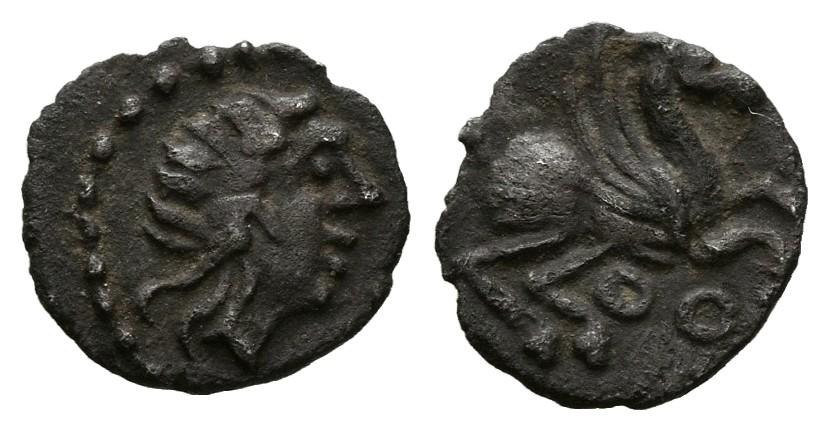 CARTAGONOVA (Cartagen, Murcia). 1/36 Shekel. (Ar. 0,15g/7mm). 200 a.C. Anv: Cabeza masculina a derecha. Rev: Pegaso a derecha, debajo dos roeles. (FAB-566). MBC+.