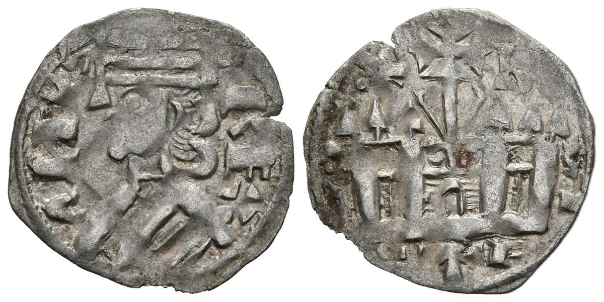 ALFONSO VIII (1158-1214). Dinero (Ve. 0,61g/17mm). Burgos. (FAB-195). Anv: Busto coronado a izquierda, alrededor leyenda: ANFVS REX. Rev: Castillo con cruz central adornada, entre estrella y B. MBC-.