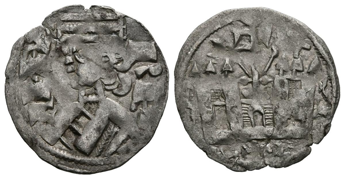 ALFONSO VIII (1158-1214). Dinero. (Ve. 0,87g/17mm). S/D. Marca de ceca Creciente. (FAB. 204.2). Anv: Busto laureado a izquierda, alrededor leyenda: ANFVS REX. Rev: Castillo con cruz central adornada y marca de ceca. MBC-.