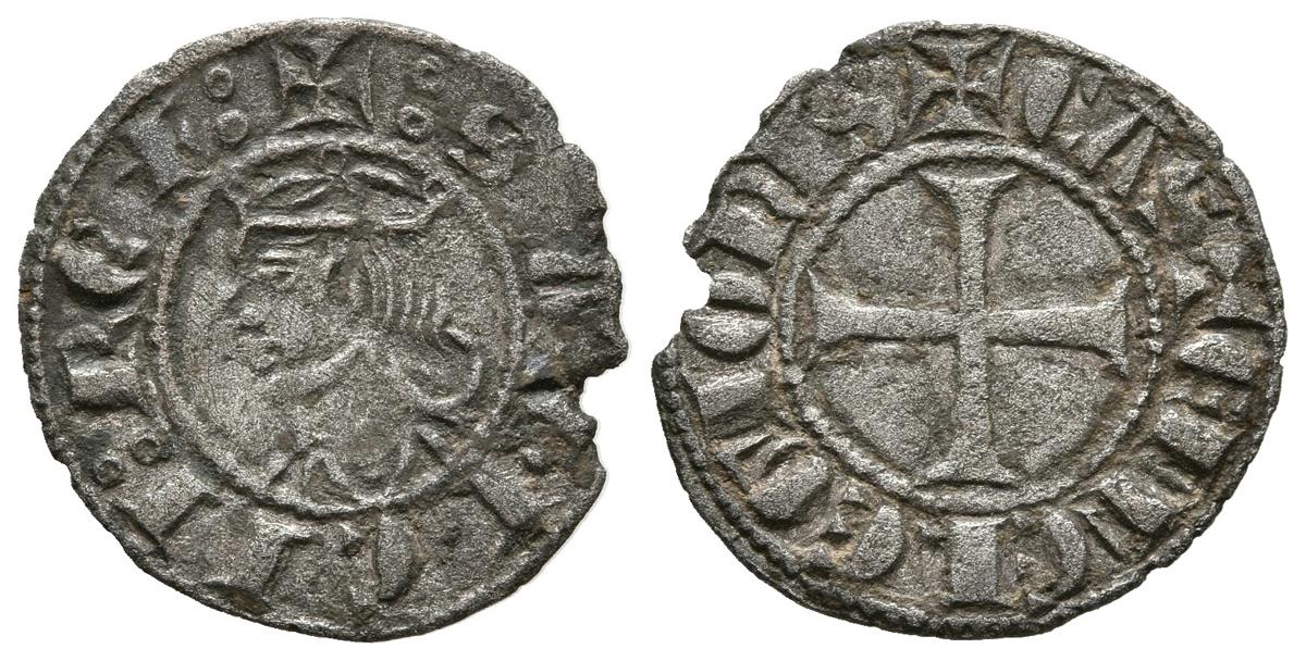 SANCHO IV (1284-1295). Seisen. (Ve. 0,64g/16mm). Sin marca de ceca. (FAB-No cita). Anv: Busto coronado a izquierda de Sancho IV, alrededor leyenda: + SANCII REX. Rev: Cruz patada sin marca de ceca en sus cuadrantes, alrededor leyenda: + CASTELLE E LEGIONIS. MBC+. Cospel faltado. Raro ejemplar sin marca de ceca.
