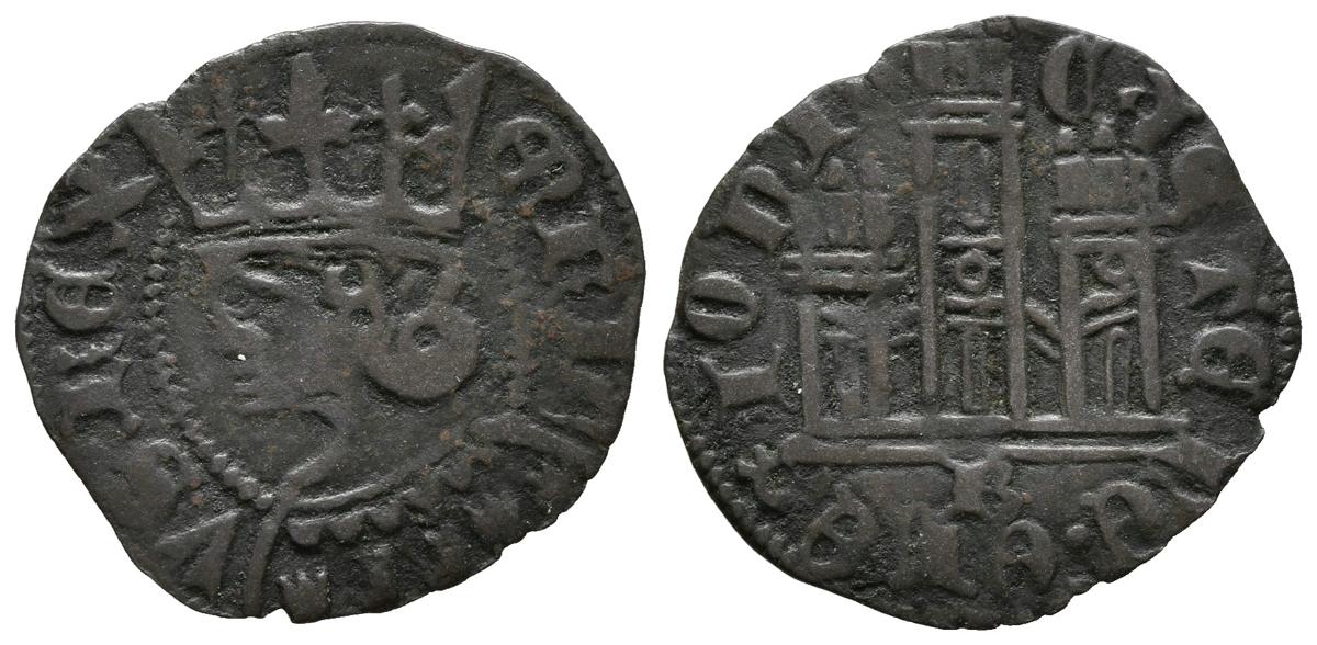 ENRIQUE II (1368-1379). Cornado. (Ve. 0,94g/20mm). Burgos. (FAB-486). Anv: Busto coronado de Enrique II a derecha, alrededor leyenda: ENRICVS REX. Rev: Castillo de tres torres, debajo marca de ceca, alrededor leyenda: CASTELLE E LEGIONIS. MBC. Pátina oscura.