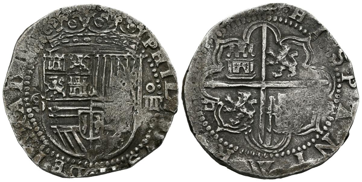 FELIPE II (1556-1598). 4 Reales. (Ar. 14,15g/31mm). S/D (Antes de 1588). Sevilla. (Cal-2019-573). Sin flor de lis entre corona y escudo. MBC.