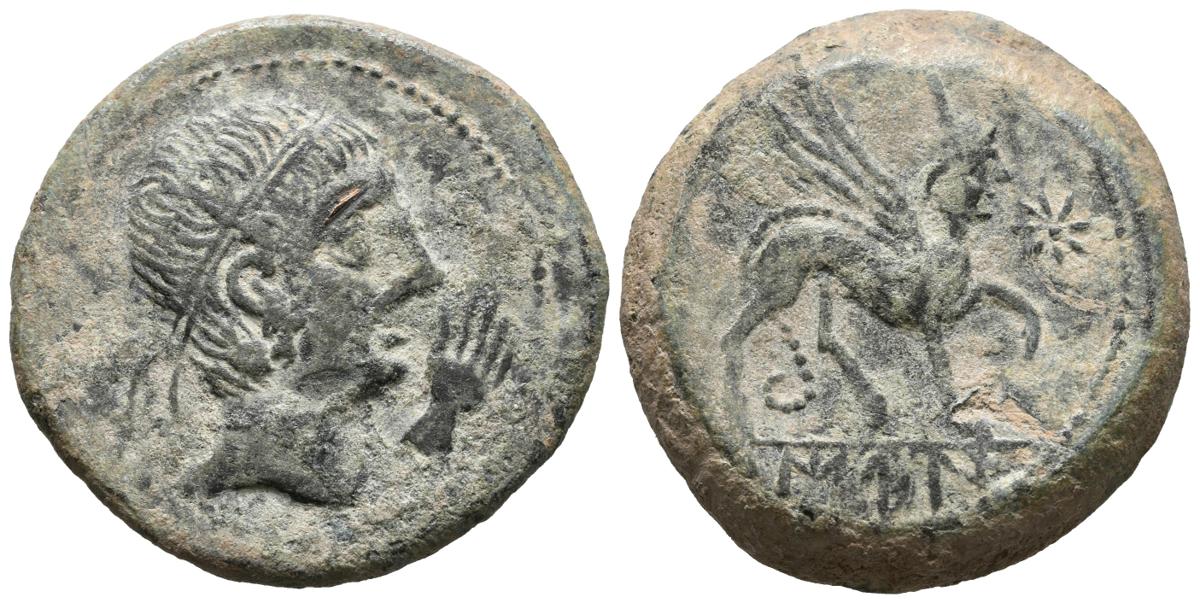 CASTULO (Cazlona, Jaén). As. (Ae. 13,48g/26mm). 180 a.C. Anv: Cabeza masculina con diadema a derecha, delante mano. Rev: Esfinge a derecha, delante estrella. (FAB-701). MBC+.