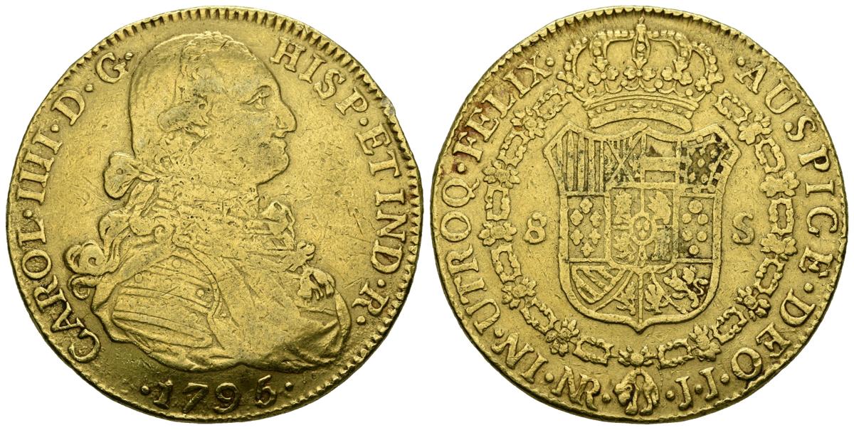 CARLOS IV (1788-1808). 8 Escudos. (Au. 26,72g/36mm). 1795. Nuevo Reino JJ. (Cal-2019-1727). MBC-.