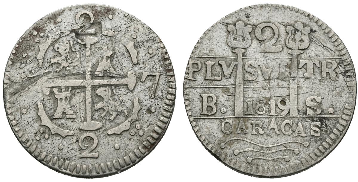 FERNANDO VII (1808-1833). 2 Reales. (Ar. 4,35g/23mm). 1819. Caracas BS. Leones y castillos. (Cal-2019-732). Acuñación realista con F-7. MBC-. Rara.