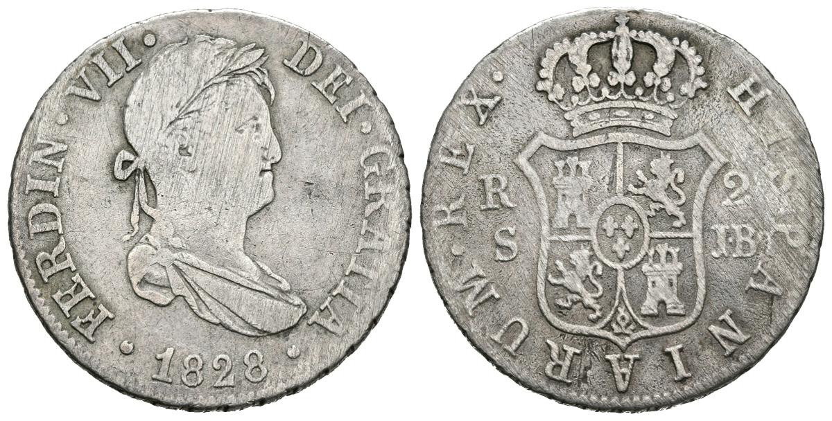 FERNANDO VII (1808-1833). 2 Reales. (Ar. 5,66g/26mm). 1828. Sevilla JB. (Cal-2019-961). MBC-. Rayitas.