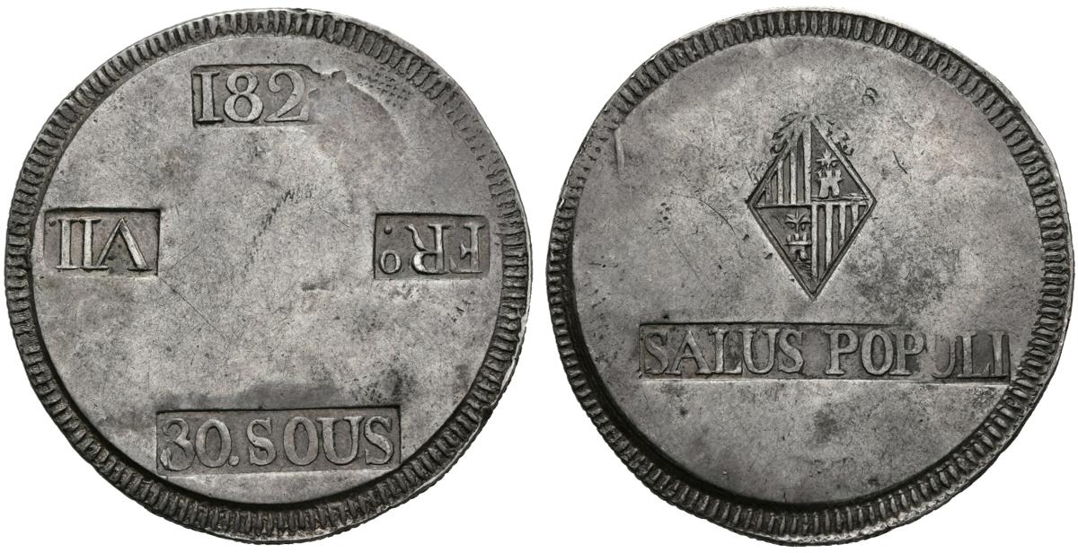 FERNANDO VII (1808-1833). 30 Sous. (Ar. 26,70g/ 41mm). 1821. Mallorca. (Cal-2019-1295). Variante FRº/VII invertidos. MBC+. Vano en anverso. Muy raro y bonito ejemplar.