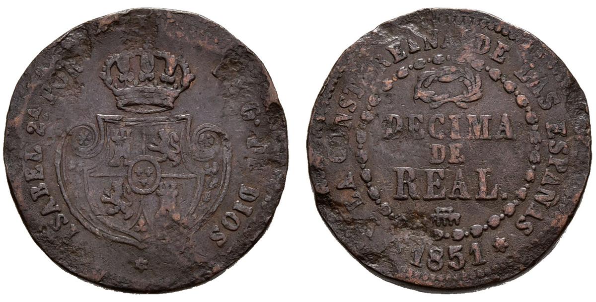 ISABEL II (1833-1868). 1 Décima de Real (Ae. 3,65g/19mm). 1851. Segovia. (Cal-2019-143). MBC-. Restos de oxidación.