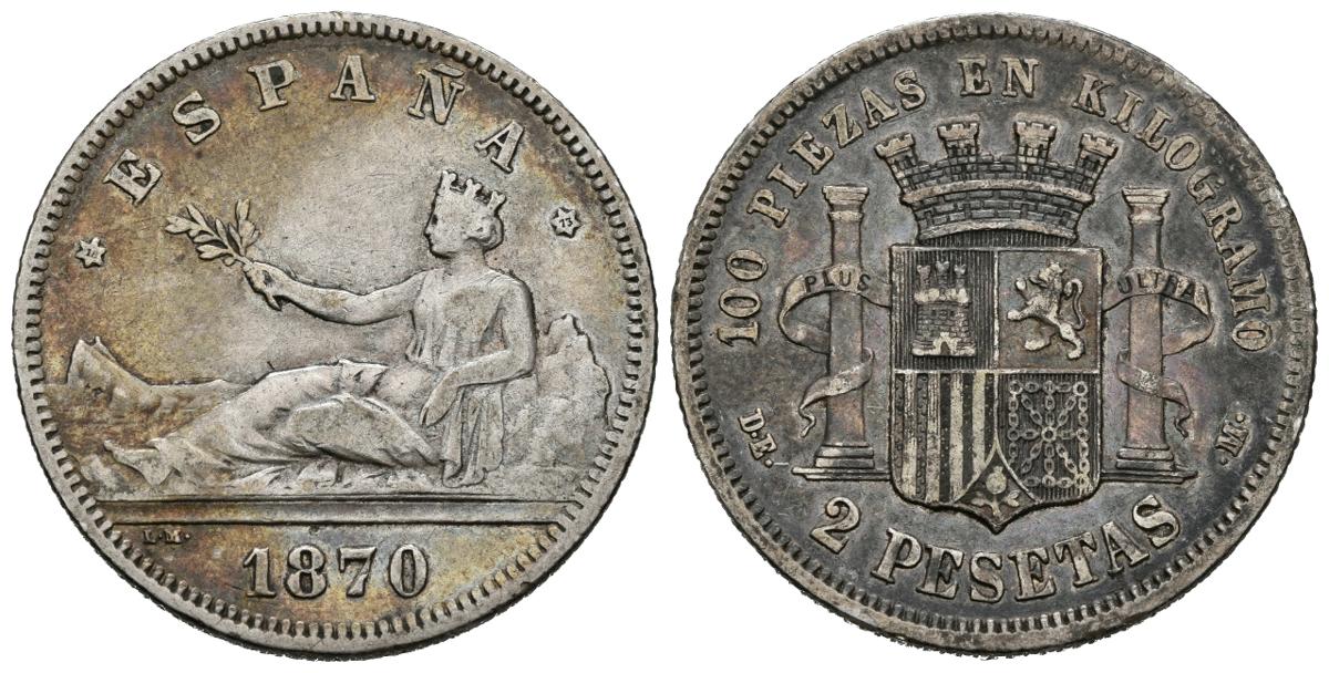 GOBIERNO PROVISIONAL (1868-1871). 2 Pesetas. (Ar. 9,68g/27mm). 1870 *18-73. Madrid DEM. (Cal-2019-28). MBC. Marquitas en reveso. Bonita pátina.