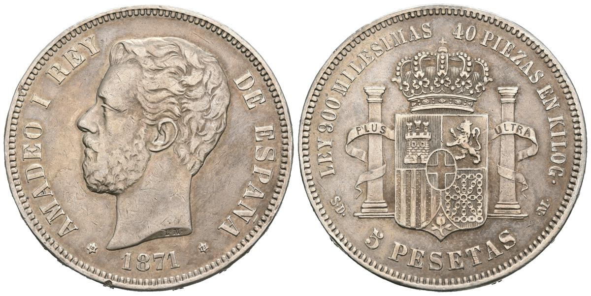 AMADEO I (1871-1873). 5 Pesetas. (Ar. 24,84g/38mm). 1871. *18-71. Madrid. SDM. (Cal-2019-1).MBC+.