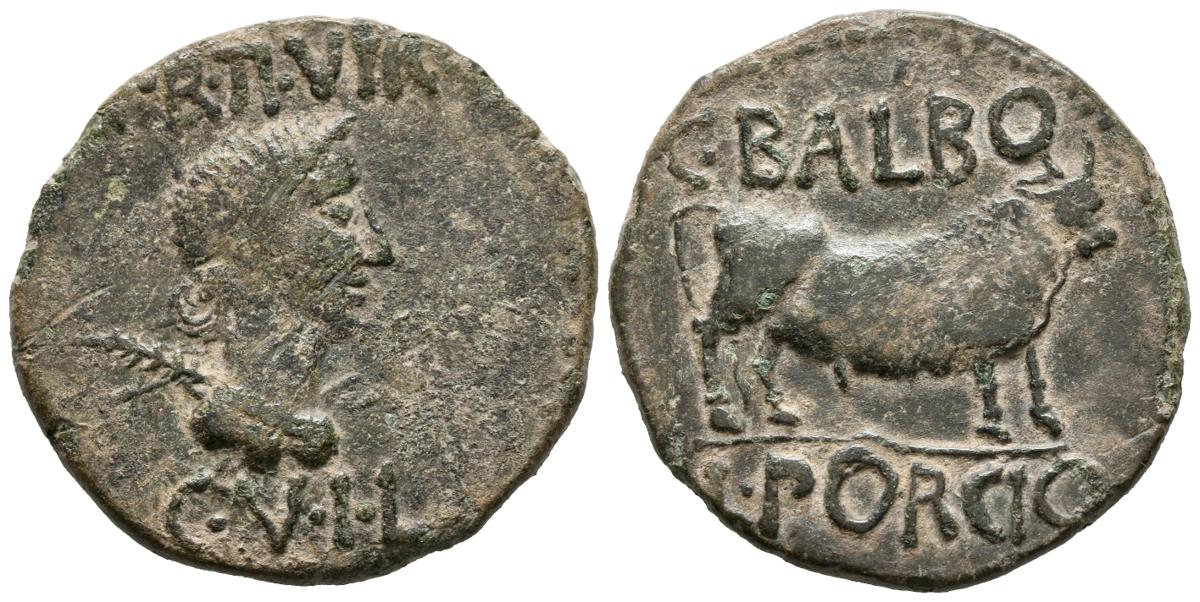 CELSE (Velilla del Ebro, Zaragoza). As. (Ae. 12,30g/31mm). 50-30 a.C. Anv: Cabeza femenina a derecha, detrás palma, encima: PR. II. VIR., debajo: C.V.I.L. Rev: Toro a derecha, encima: C. BALBO, debajo: L. PORCIO. (FAB-800). MBC.